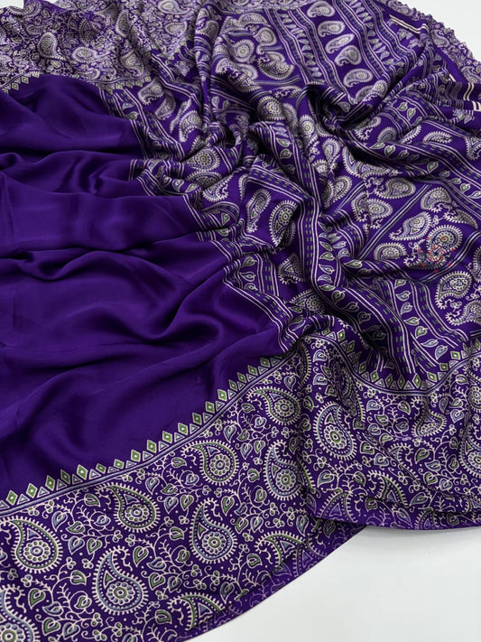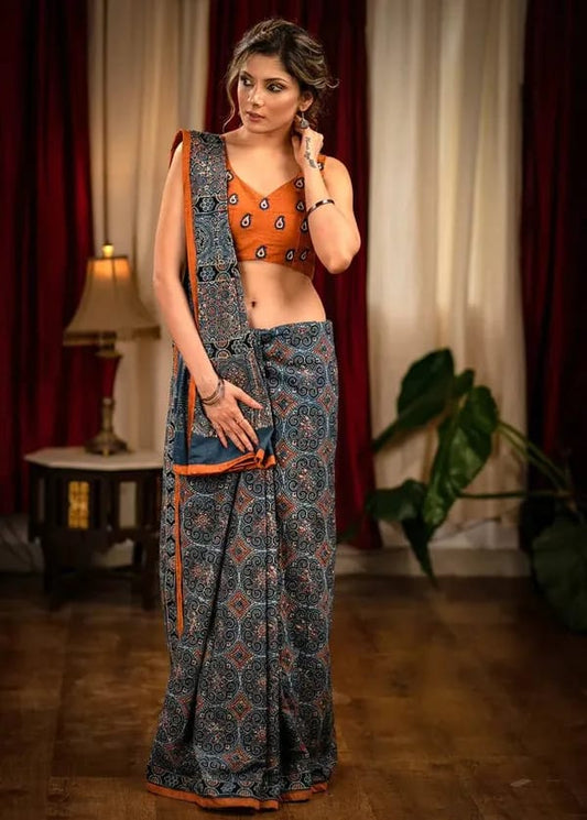 Ajrakh Print Premium Silk fabric Saree With very soft in texture.. Light weight Silk Fabric...