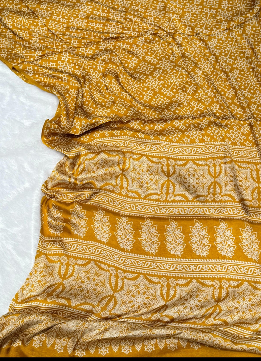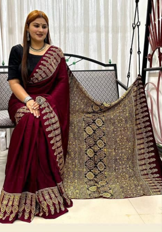 Ajrakh Print Premium Silk fabric Saree With very soft in texture.. Light weight Silk Fabric...