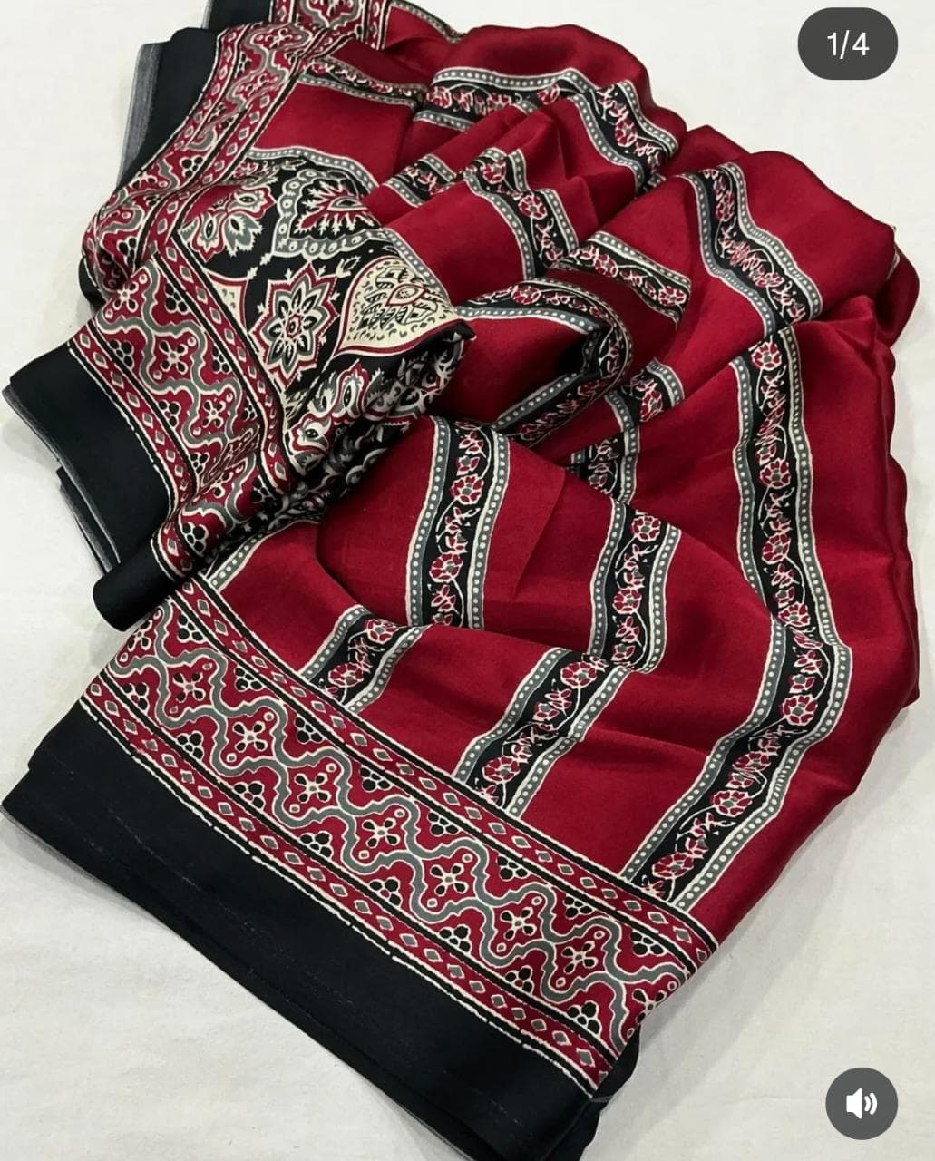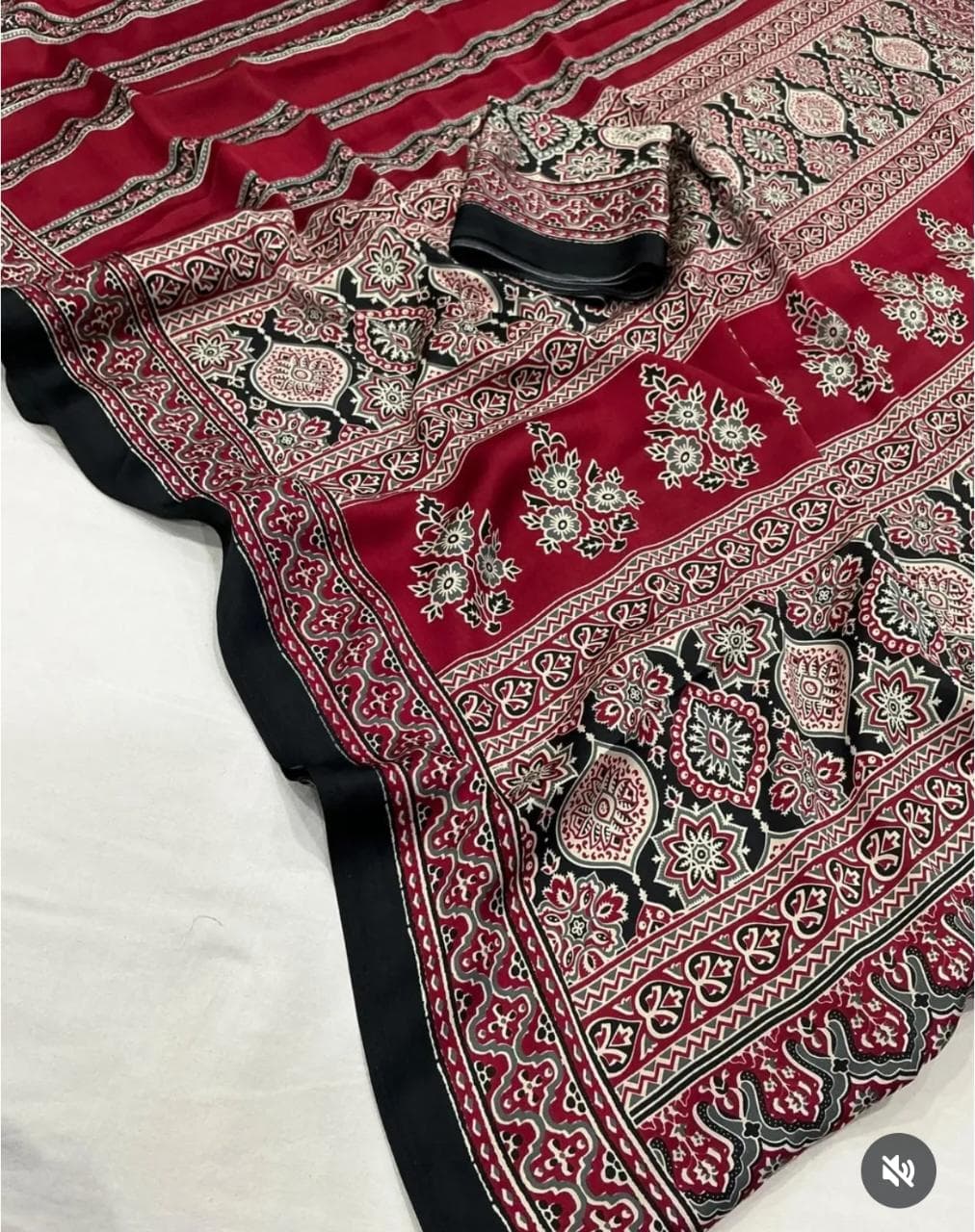 • Elevate your wardrobe with the Akruti Modal Silk Ajrakh Natural Printed Saree. Crafted from luxurious red modal silk, this saree features exquisite Ajrakh natural prints that blend traditional artistry with contemporary style. Its lightweight fabric ensures effortless draping, allowing you to achieve a polished look quickly and comfortably. Perfect for those who appreciate expert craftsmanship and modern elegance in one graceful ensemble.