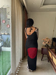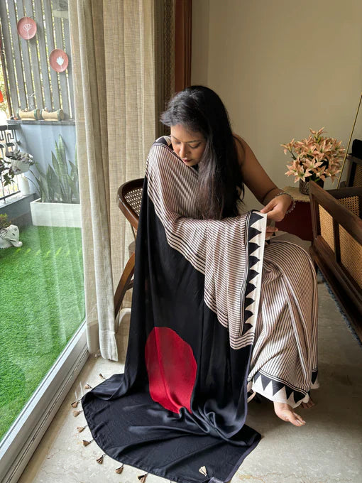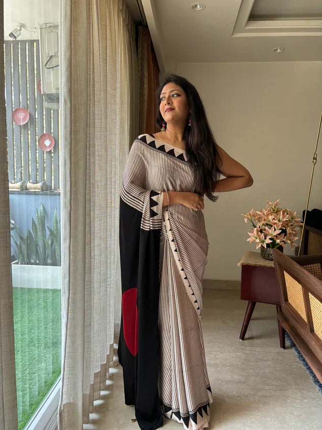 BEAUTIFULL CREAM STRIPTED SAREE WITH RED BINDI PALLU.