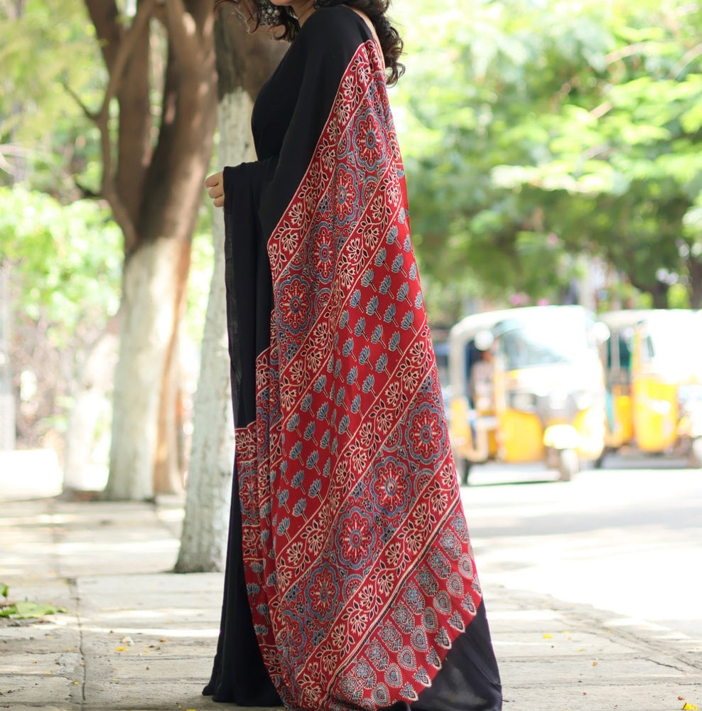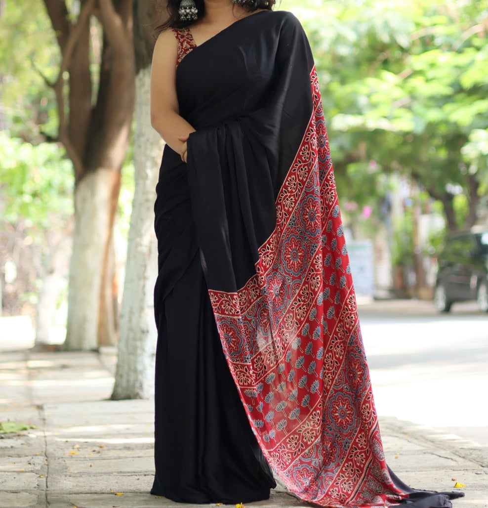 Ajrakh Digital Print Border with Ajrakh Rich Pallu With Contrast Blouse