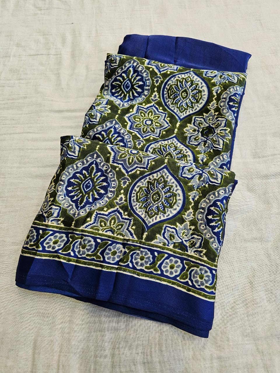 Ajrakh Print Premium Silk fabric Saree With very soft in texture.. Light weight Silk Fabric with a rich glaze .