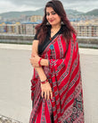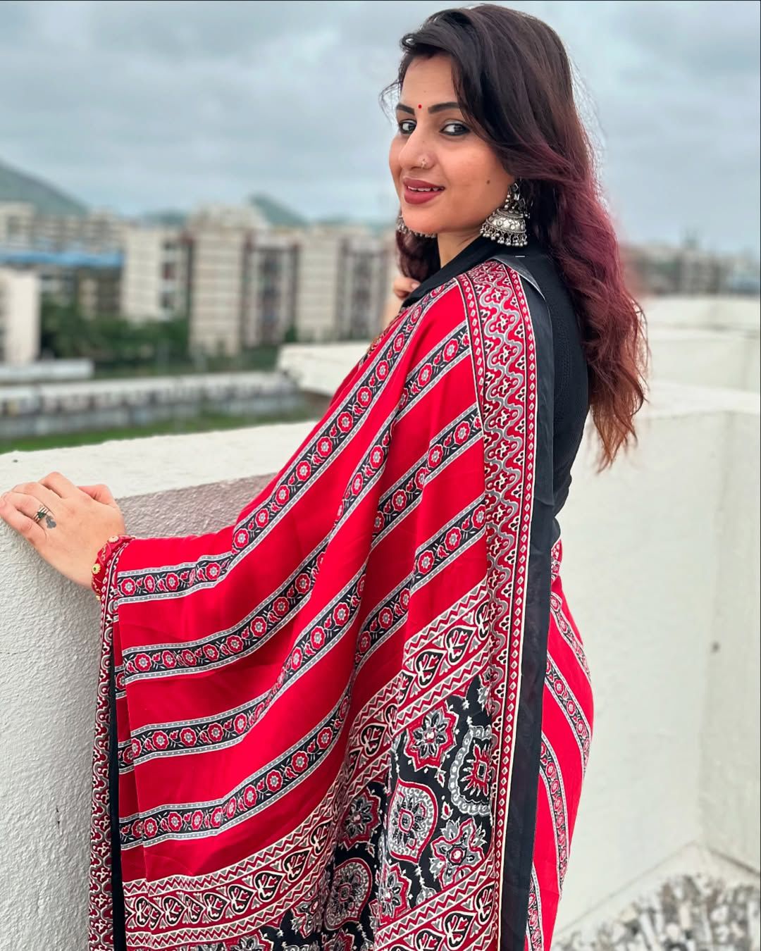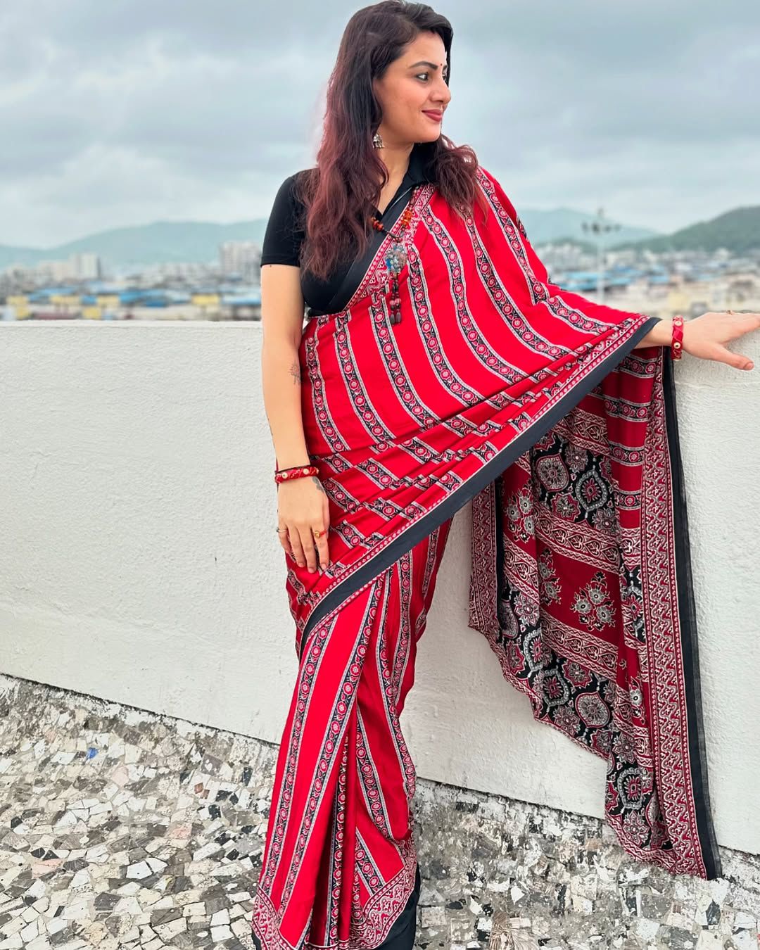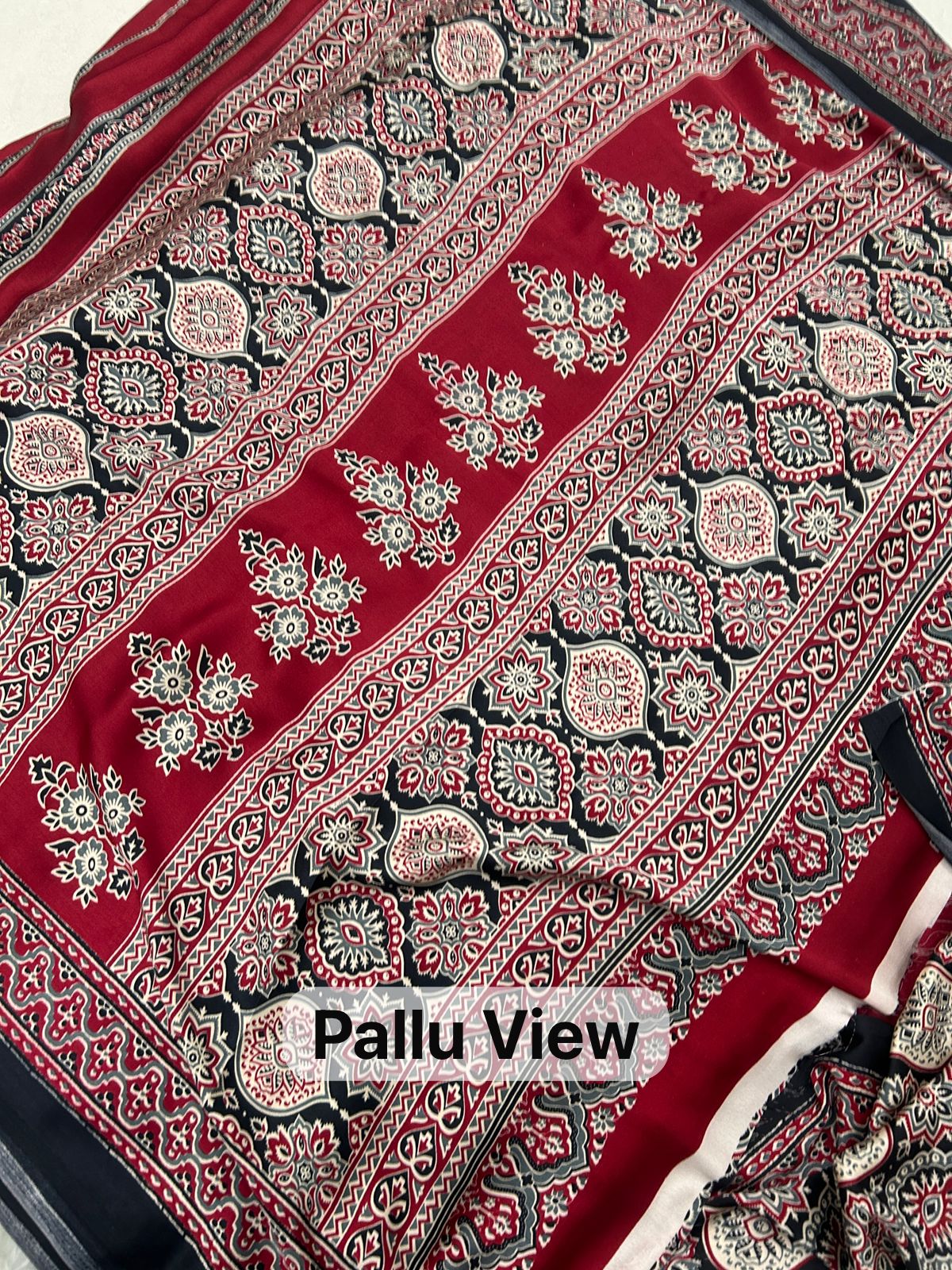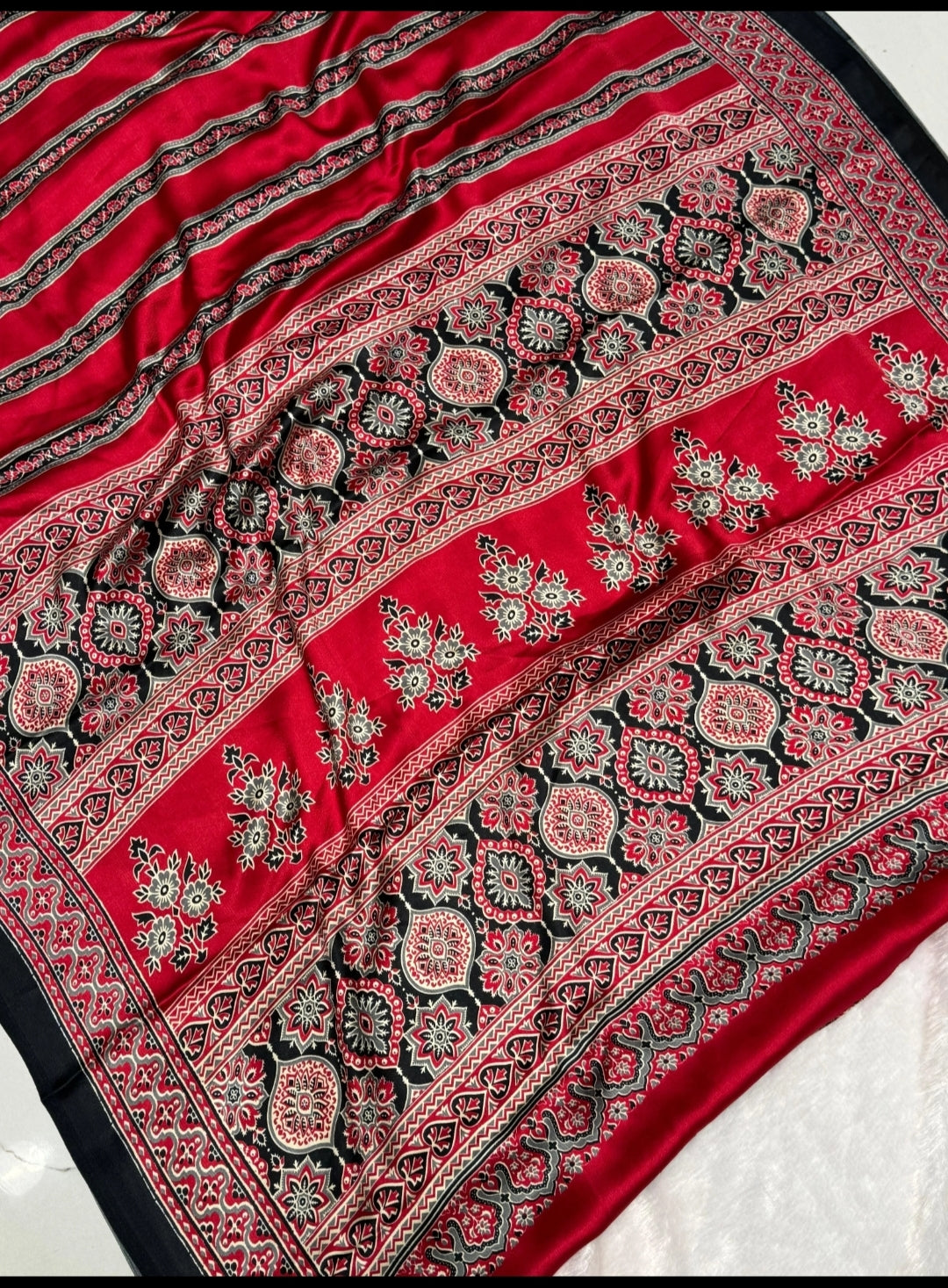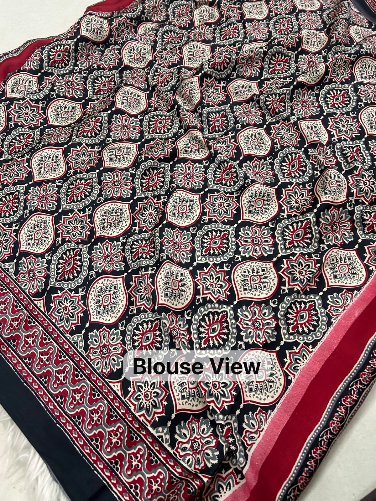 Ajrakh Print Premium Silk fabric Saree With very soft in texture.. Light weight Silk Fabric with a rich glaze .