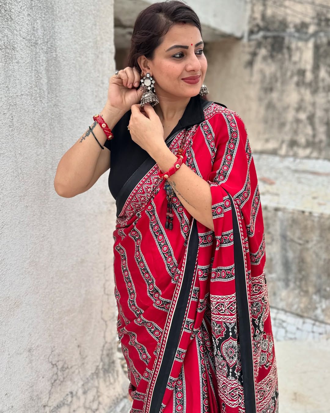 Ajrakh Digital Print Border with Ajrakh Rich Pallu With Contrast Blouse