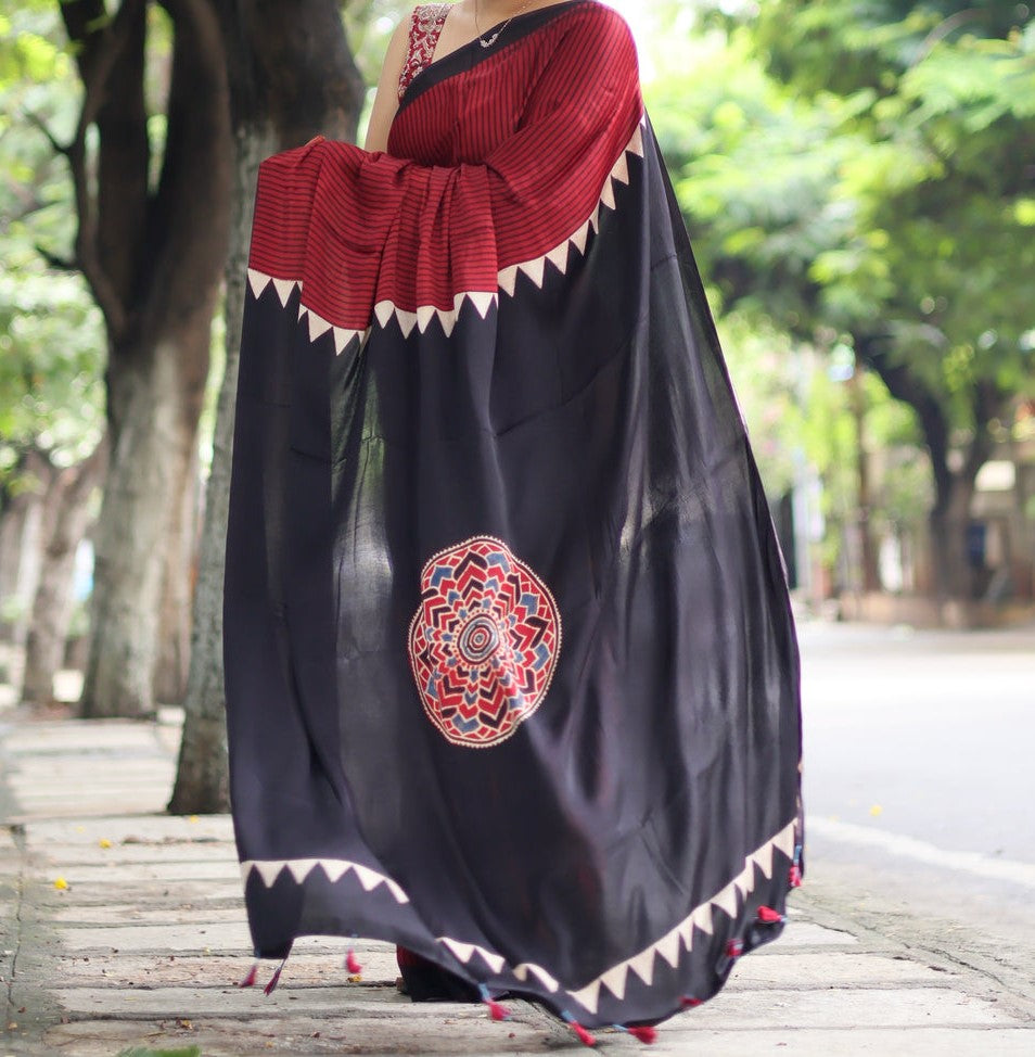 Ajrakh Print Premium Silk fabric Saree With very soft in texture.. Light weight Silk Fabric with a rich glaze .