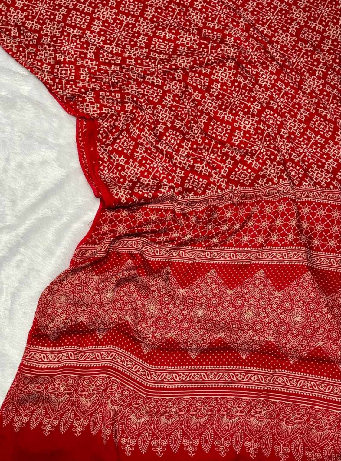 • Elevate your wardrobe with the Akruti Modal Silk Ajrakh Natural Printed Saree. Crafted from luxurious red modal silk, this saree features exquisite Ajrakh natural prints that blend traditional artistry with contemporary style. Its lightweight fabric ensures effortless draping, allowing you to achieve a polished look quickly and comfortably. Perfect for those who appreciate expert craftsmanship and modern elegance in one graceful ensemble.